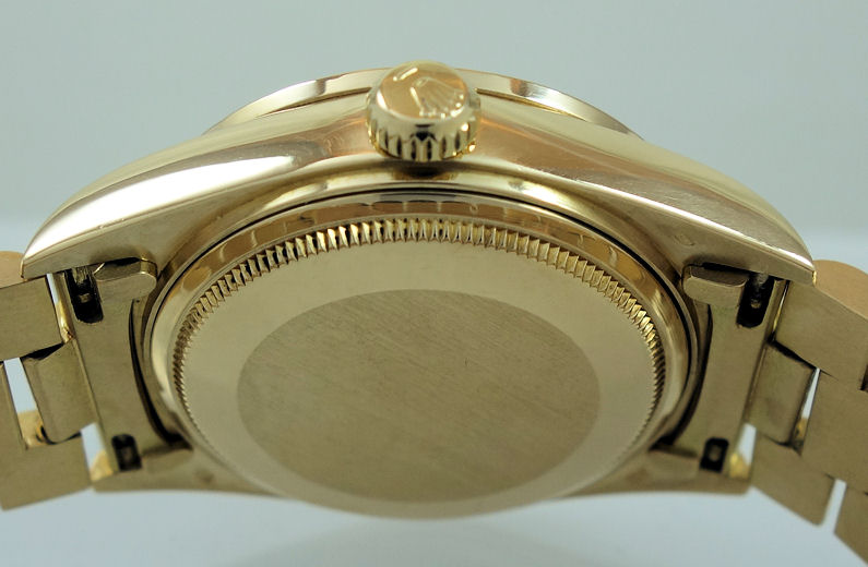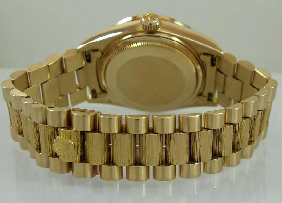 | Band | 18k Yellow-Gold President bracelet with Bark-finish in the centre and concealed clasp. |