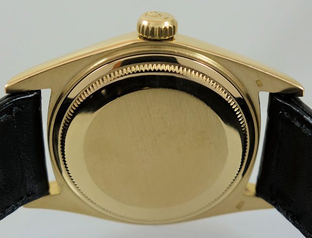 18k Yellow-Gold Oyster case with fluted bezel, screw-down crown and Plexiglas.