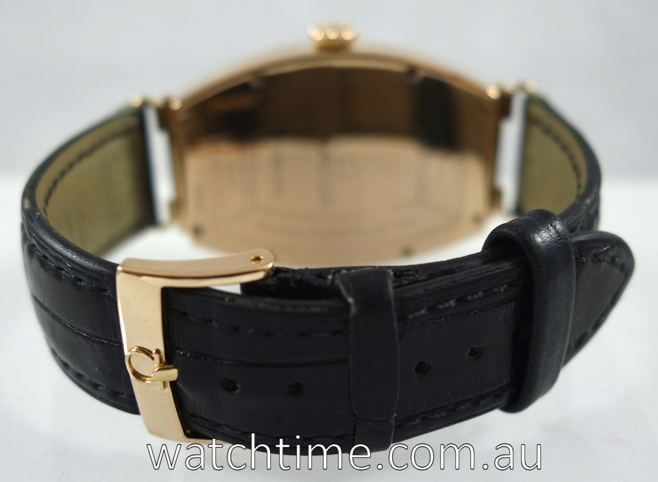 | Case | Polished 18k Rose-Gold Tonneau case with onion crown, articulated wire-lugs, domed sapphire crystal and individually numbered case-back, fixed with 8 screws. |