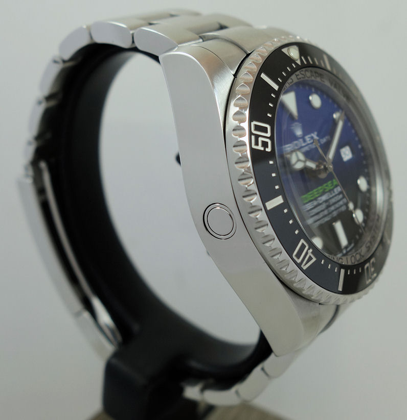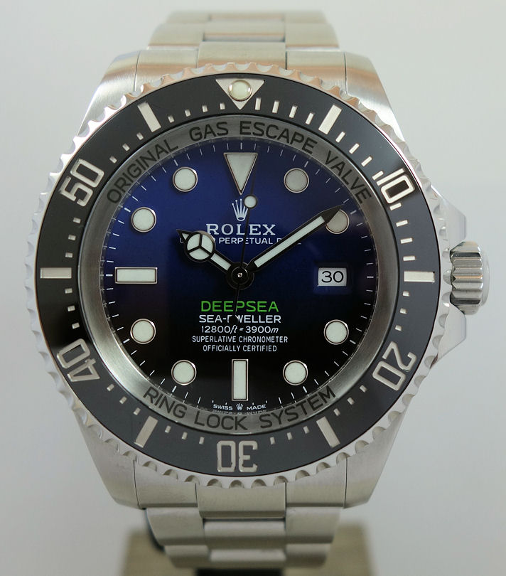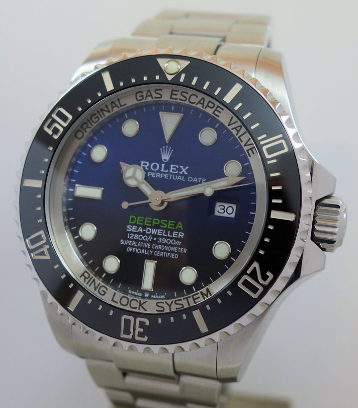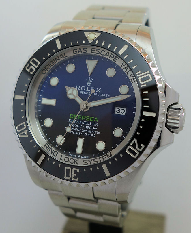 “Commemorating James Cameron’s historic solo dive. From brilliant blue to bottomless black, it’s two colour gradient dial celebrates one man’s journey to the deepest place on earth: the bottom of the Mariana Trench. Waterproof to a depth of 3,900m (12,800 feet) with a unidirectional 60-minute rotatable bezel, the Rolex Deepsea is amongst the ultra-resistant divers’ watches engineered by Rolex for deep-sea exploration.”