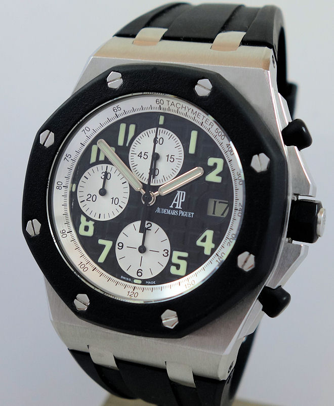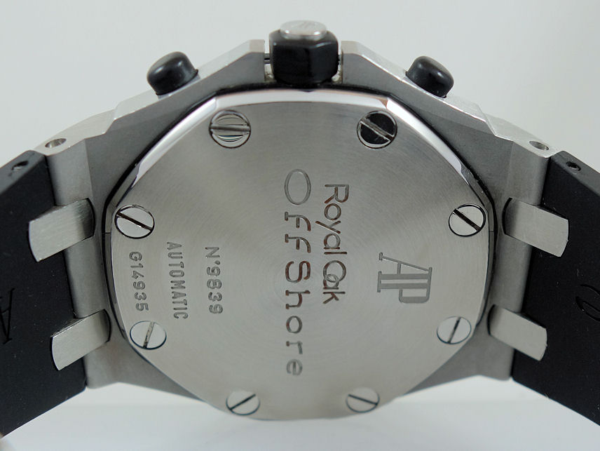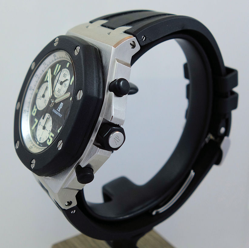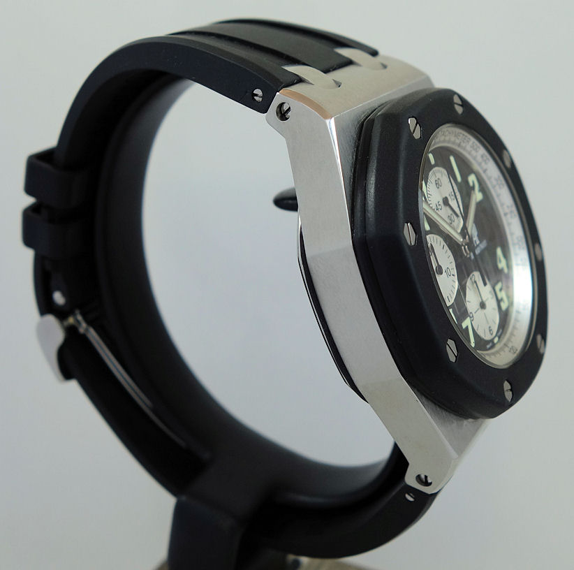 | Case | Brushed stainless-steel case, black octagonal bezel secured with eight screws, matching rubber clad pushers and screw-down winding crown. Sapphire crystal glass. |