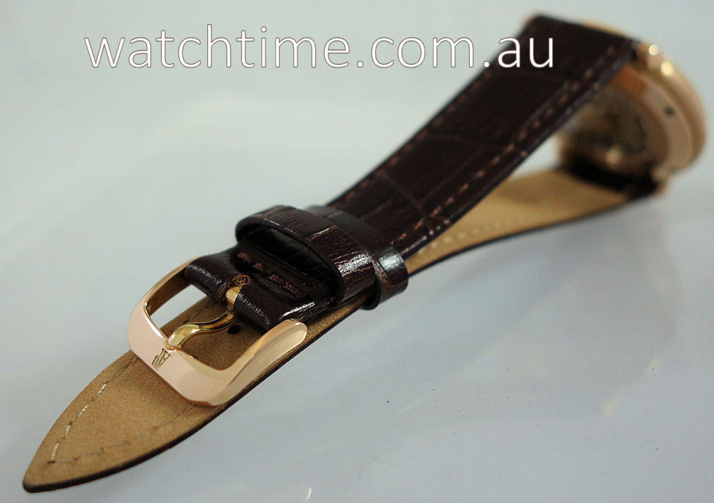 | Band | Dark-brown croco-grain leather and original 18k Rose-Gold pin buckle. |