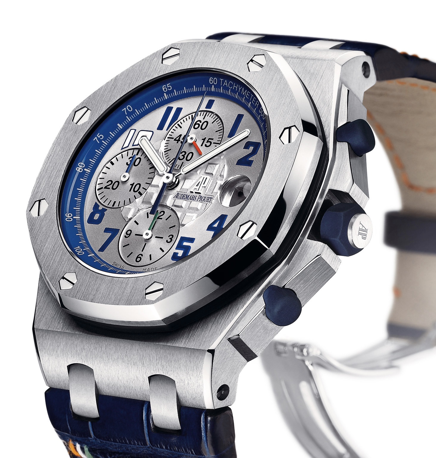 Cal. 3126/3840 automatic movement, 59 jewels, silvered engine turned dial with textured center, applied Arabic numerals, outer blue tachymeter scale, three engine turned subsidiary dials for constant seconds, 30 minute and 12 hour registers, magnified window for date, tonneau-shaped water-resistant-type case, octagonal bezel secured by eight screws, two chronograph buttons in the band, screw down crown, engraved back secured by eight screws, stainless steel Audemars Piguet deployant clasp, case, dial and movement signed