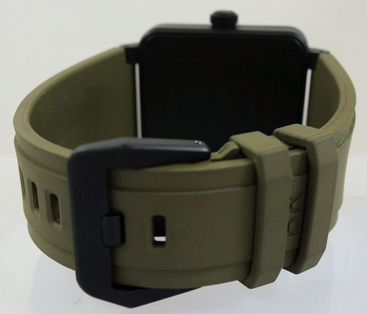 | Band | Khaki rubber and black pin buckle. No fabric strap. Two additional Camo rubber straps. |