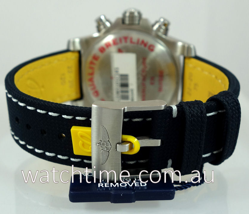 Navy-Blue fabric with contrasting white-stitch, yellow leather lining and steel pin buckle by Breitling.