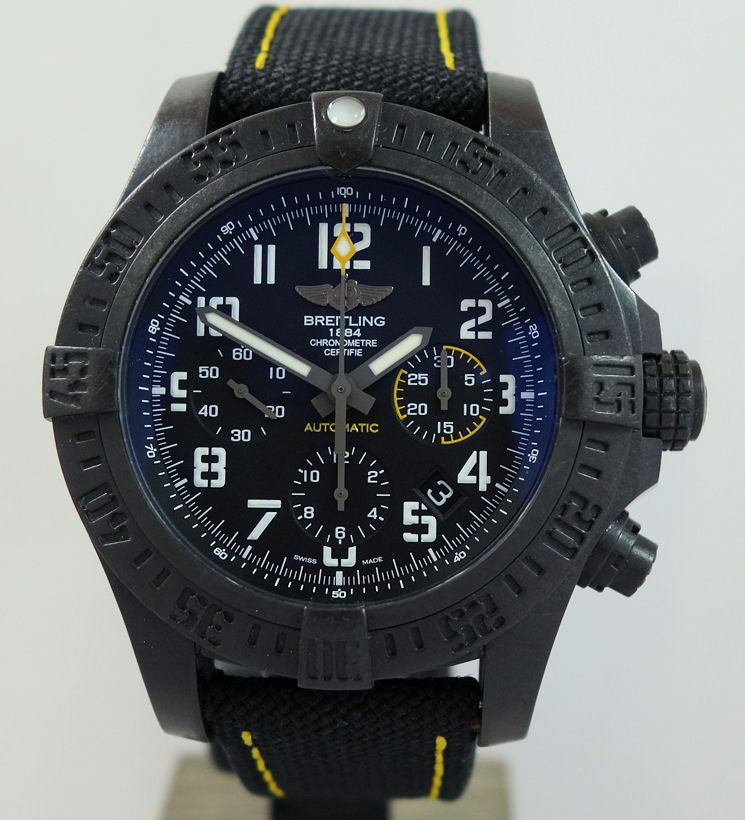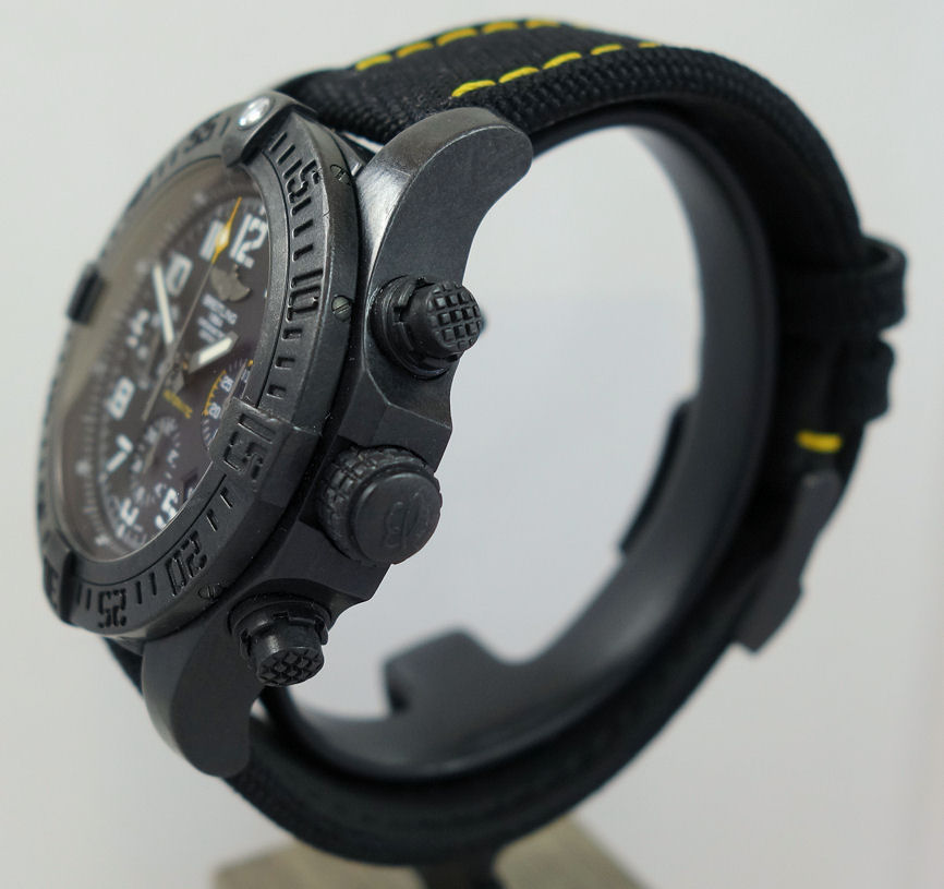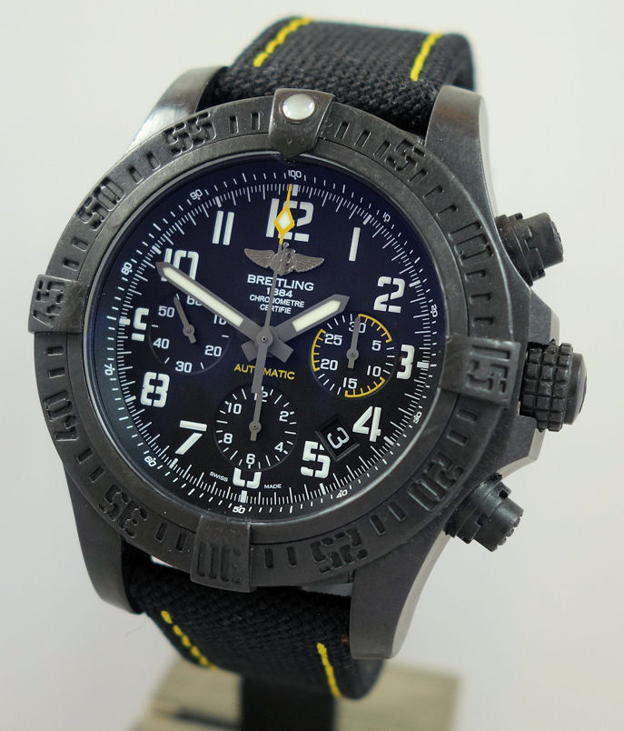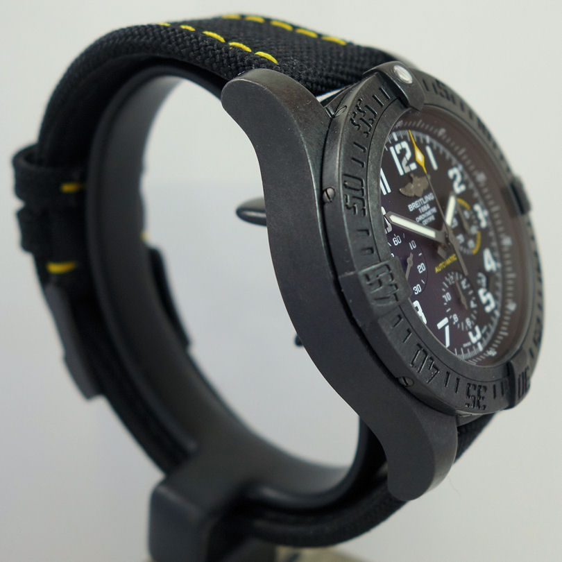 The 45mm version of the super-charged Breitling, this selfwinding chronograph houses a high-performance Manufacture Breitling Caliber 01 in an ultra-sturdy, ultra-light case in Breitlight®: an avant-garde alloy used for the first time in the watch industry. Its original, technical and powerful look is accentuated by a black or yellow dial with aviation-inspired white stencil-type numerals, as well as an exclusive strap combining rubber and high-resistance Military textile fiber. An instrument built for extremes.