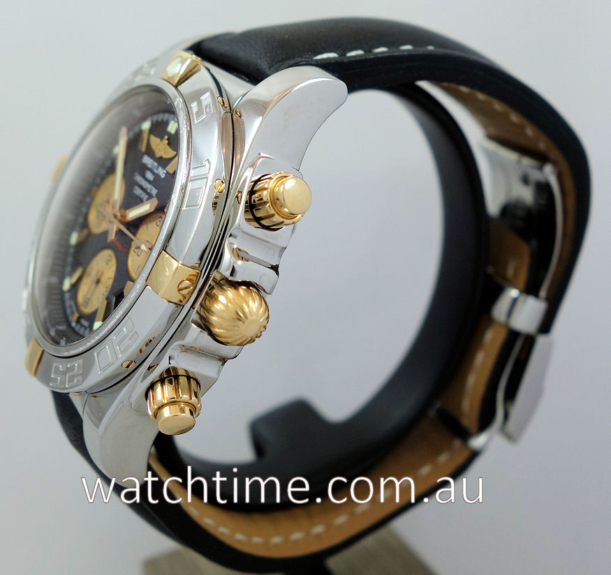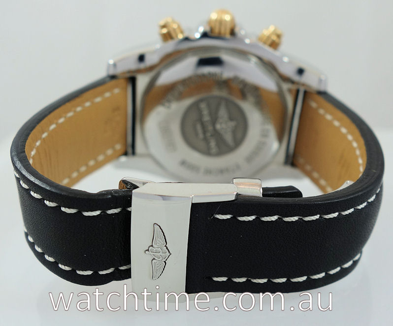 | Band | Black calf leather and steel folding clasp by Breitling. |