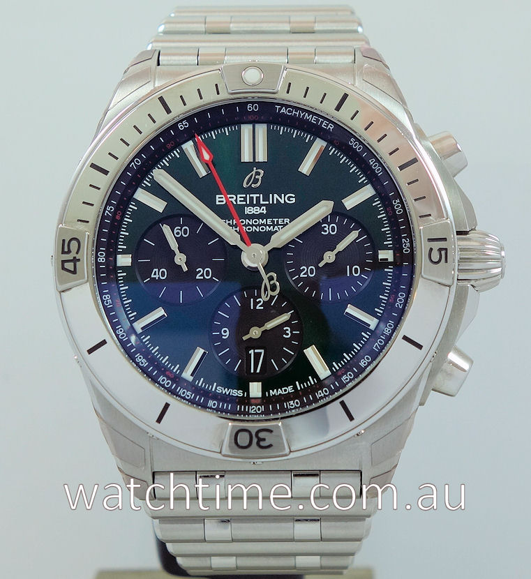 “Breitling’s all-purpose watch for your every pursuit. The Chronomat holds a significant place in Breitling’s history. Introduced in 1984, at a time where extra-thin quartz timepieces were the order of the day, Breitling placed a bold bet on an impressively proportioned mechanical watch. Based on the Frecce Tricolori chronograph, which had been developed and launched in 1983 in collaboration with the famed Italian aerial squadron, the Chronomat celebrated Breitling’s centenary in style and marked the return of the mechanical chronograph to its rightfully prominent place at the brand which had built its global reputation on these incredible watches. Available in a variety of materials including stainless steel and 18k red gold, the Chronomat features a 42mm case and the iconic bezel with the four rider tabs. Available with a range of black, blue, silver, and copper dials, the Chronomat is matched to the signature “Rouleaux” bracelet and is powered by the in-house Breitling Manufacture Caliber 01, a COSC-certified chronometer.”