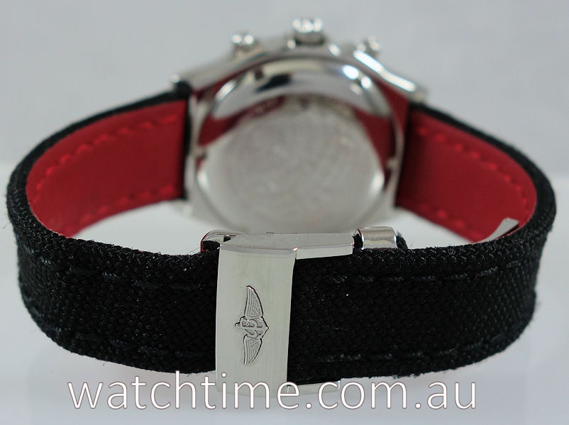 | Band | Black fabric strap with red lining and steel flip-lock clasp by Breitling. |