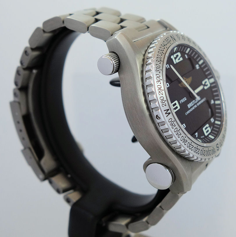 | Case | Satin-finish Titanium case, bi-directional rotating bezel and push crown. Emergency beacon on bottom rh side. Sapphrie crystal glass with AR coating. |