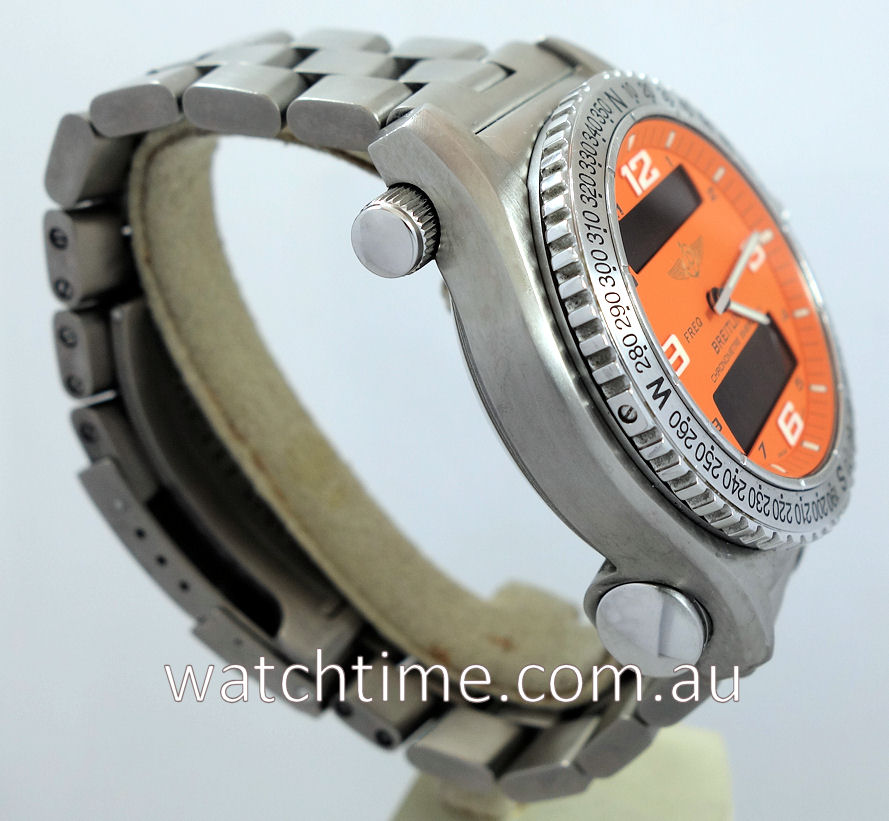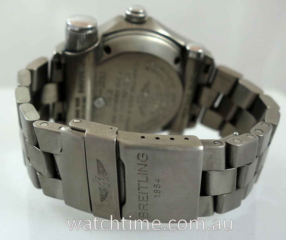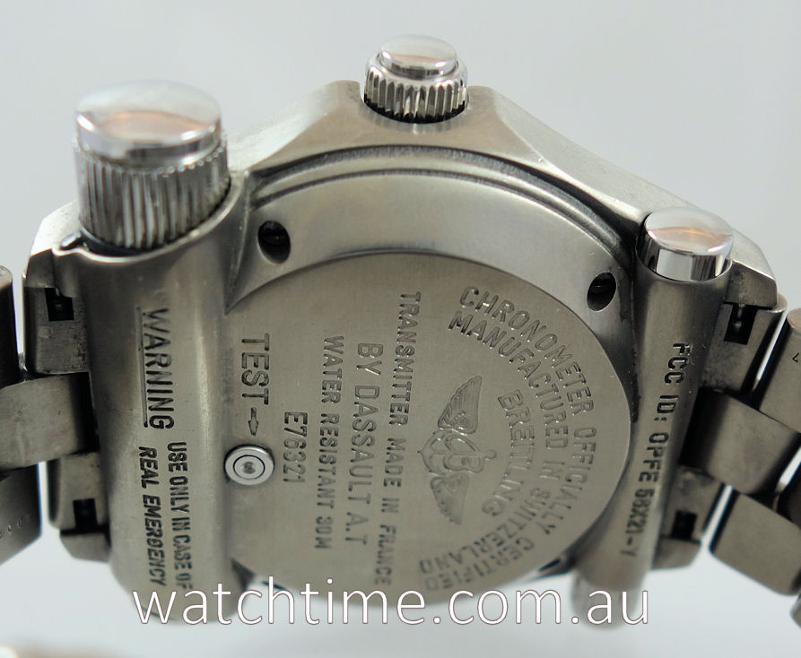 | Case | Satin-finish Titanium case, bi-directional rotating bezel and push crown. Emergency beacon on bottom rh side. Sapphrie crystal glass with AR coating. |