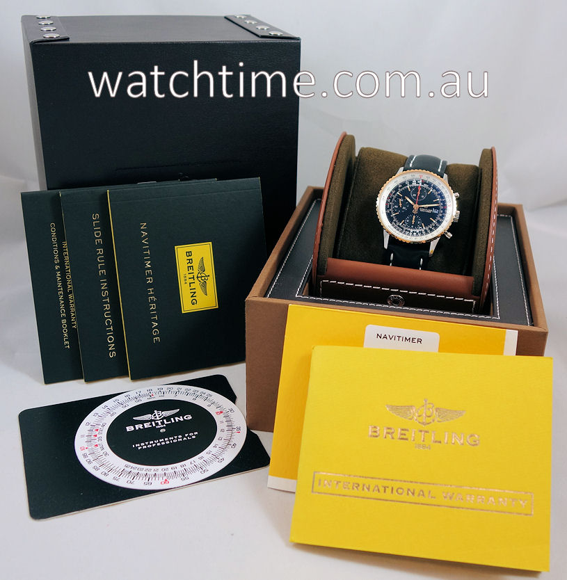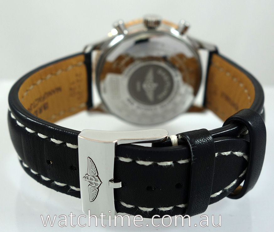 | Band | Black calf leather with steel pin buckle by Breitling. |