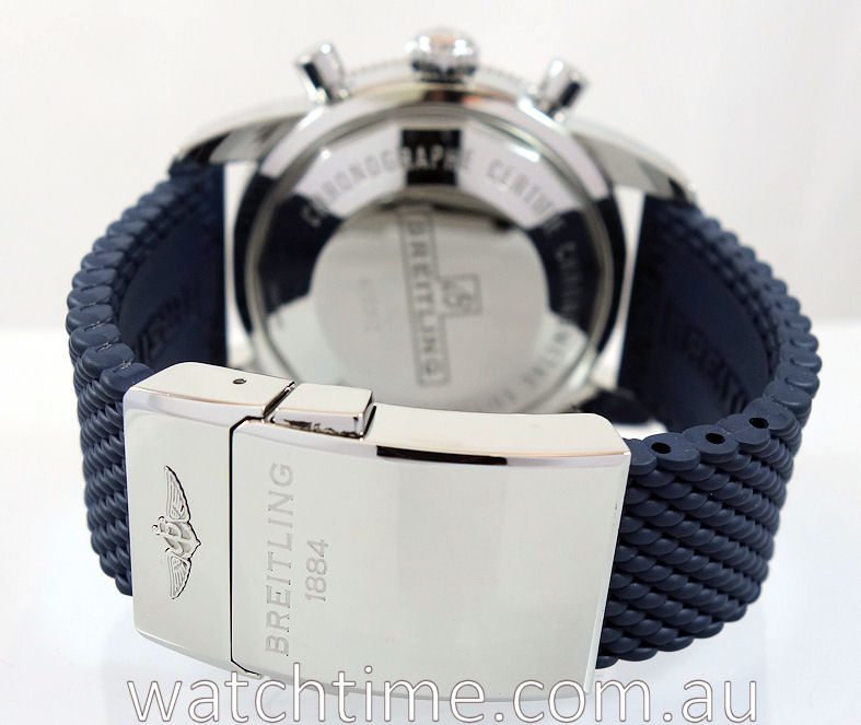 | Band | Blue ‘mesh’ rubber strap and steel folding clasp by Breitling. |