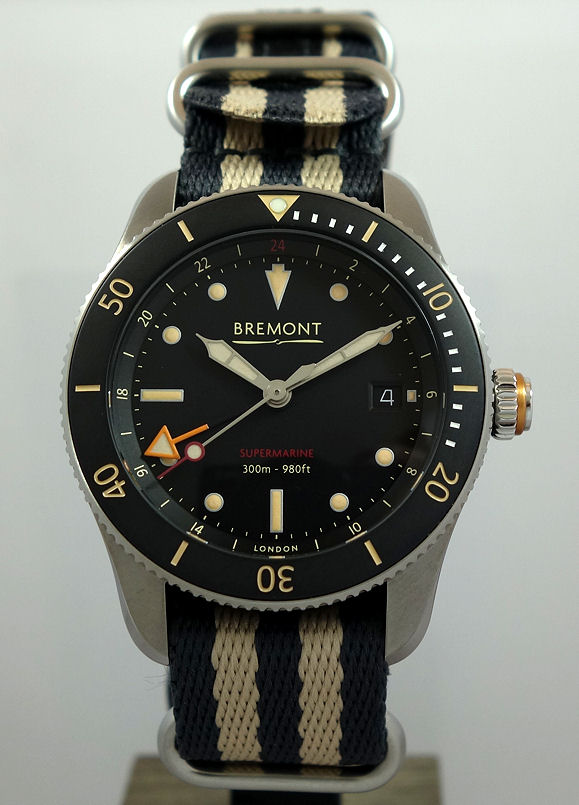 | Dial | Black metal dial with intergrated 24-hr ring. Vintage coloured Super LumiNova indexes and hands with red seconds hands and burnt-orange GMT hand. Date at 3. |