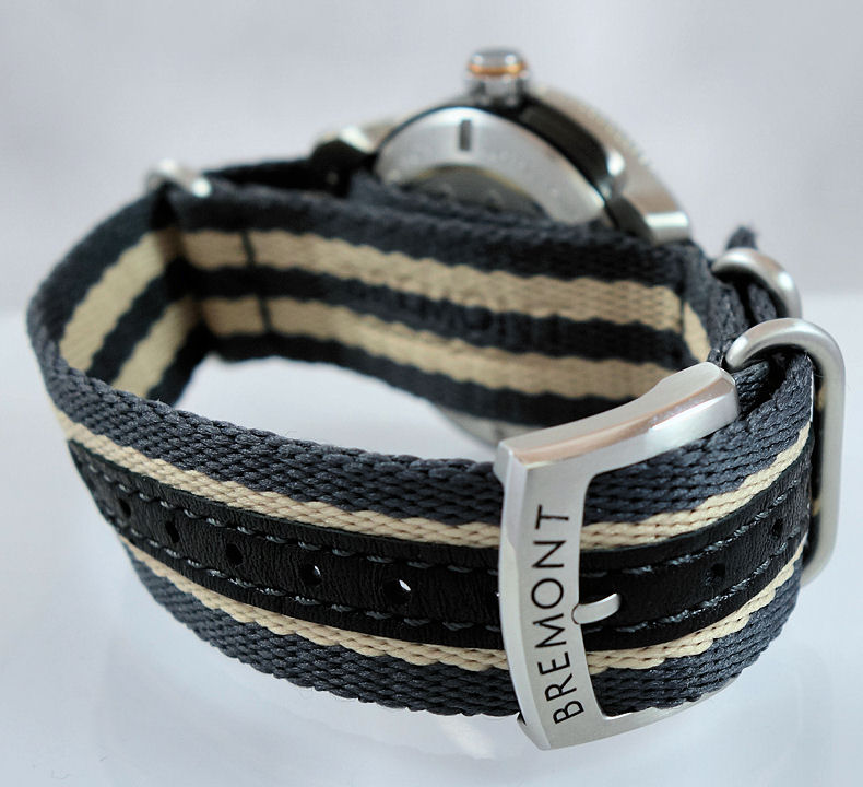 | Band | Grey stripe NATO strap and steel pin buckle. |