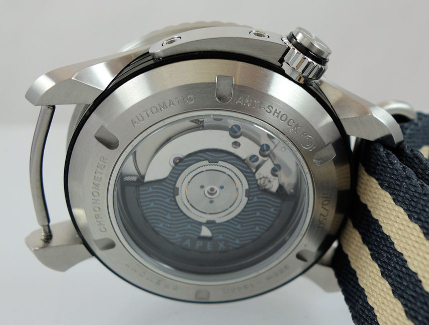 Turning the watch over reveals its open sapphire case back through which the custom rotor can be seen, designed to reprise the dial with the shark fin motif in blue. Despite having an open case back, the Waterman Apex is water resistant to 500m with the movement being protected by Bremont’s patented anti-shock vibration mount technology. True to form, this is a watch that can be tested to extremes.