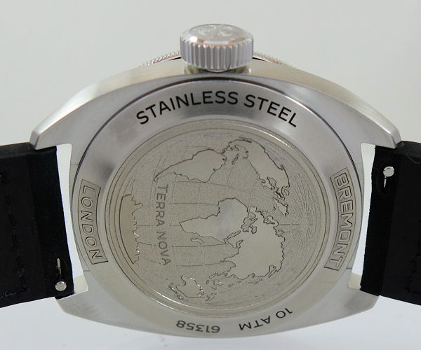 The watch’s dial features oversized numerals cut in full-block Super-LumiNova® for increased legibility in low light conditions. The Super-LumiNova® application is continued across the indexes on the broken railroad minute track and vintage inspired hands. The closed case back is engraved with a unique design featuring a charted map of the world and the words ‘Terra Nova’.