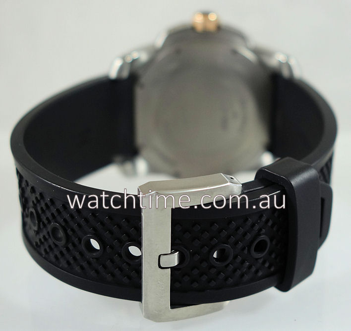 | Case | Stainless-steel case with ADLC-coated rotating 18K Rose-Gold bezel with Super-LumiNova indicator, gold faceted crown set with a faceted synthetic spinel. Sapphire crystal glass. |