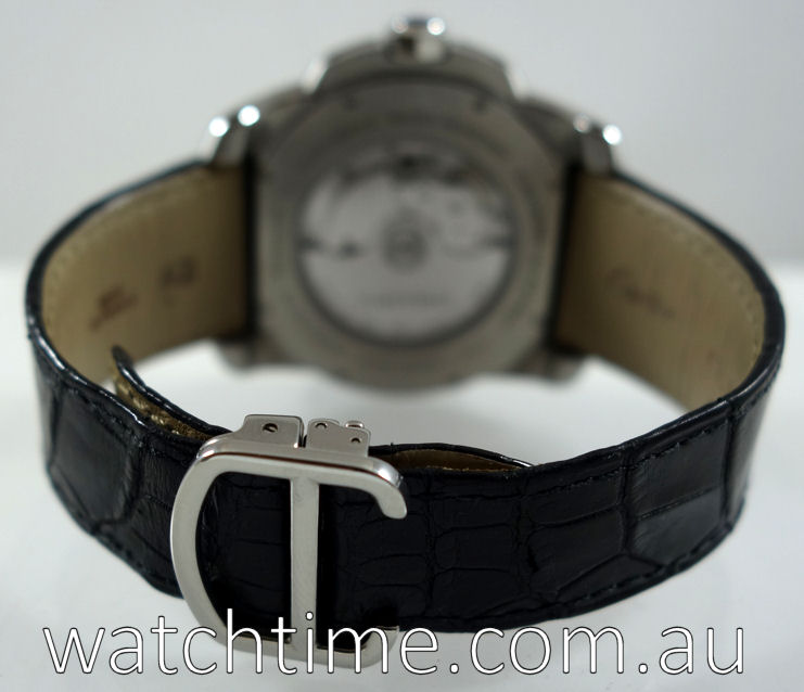 | Band | Black Alligator leather and double adjustable deployant clasp by Cartier. |