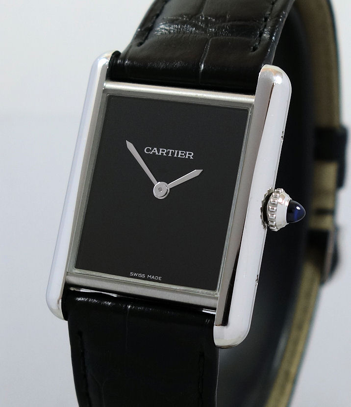 Tank Must watch, large model, High Autonomy quartz movement. Steel case, beaded crown set with a synthetic cabochon-shaped spinel, black lacquered dial, rhodiumized steel sword-shaped hands, semi-matte black alligator leather strap, steel ardillon buckle. Case dimensions: 33.7 x 25.5 mm, thickness: 6.6 mm. Water-resistant up to 3 bar (approx. 30 meters/100 feet).