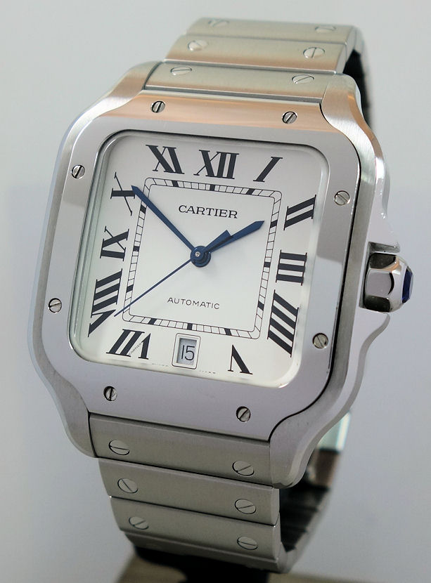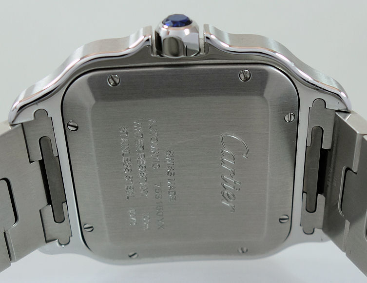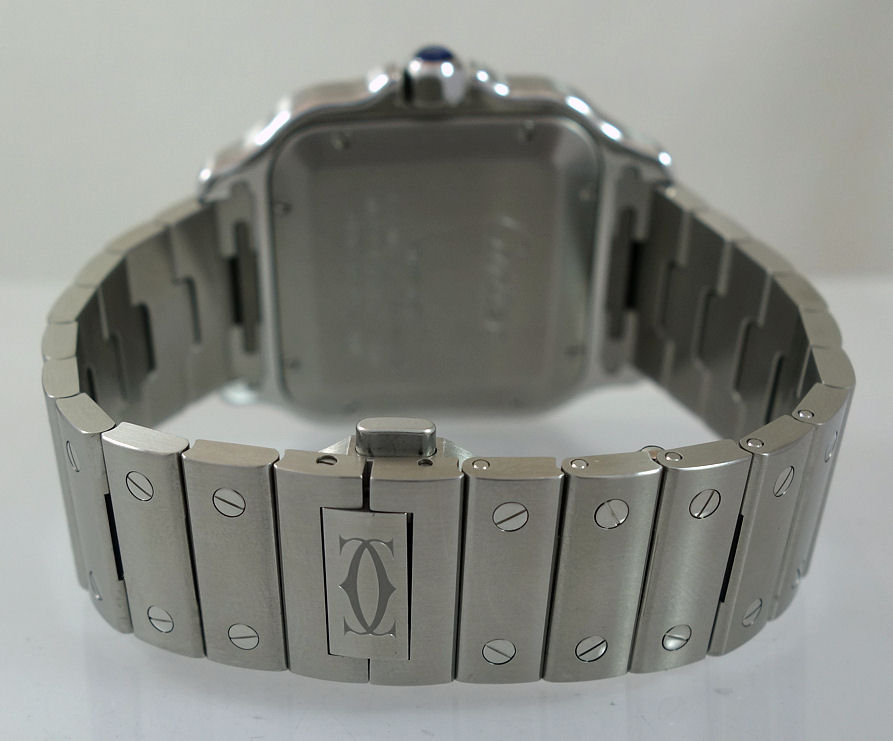 | Case | Brushed Stainless-steel with polished bezel feat. the distinctive Santos screws, curved Sapphire crystal and crown set with a blue spinel. |