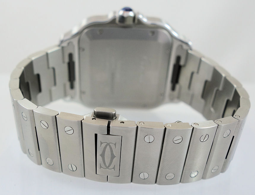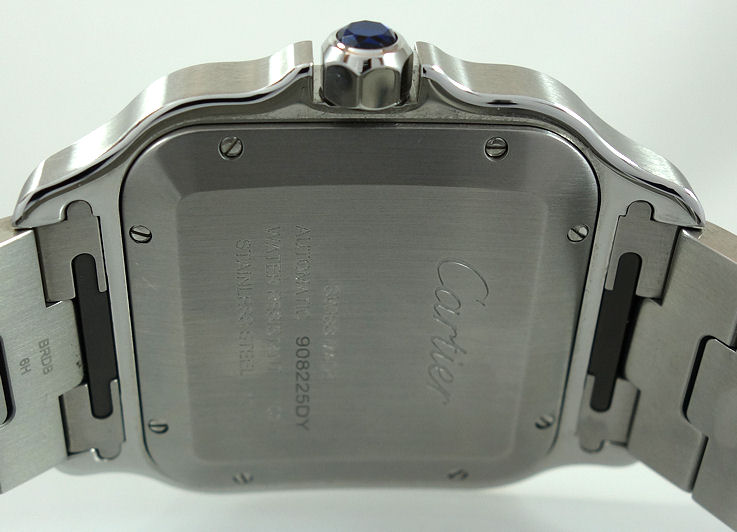 | Case | Brushed Stainless-steel with polished bezel feat. the distinctive Santos screws, curved Sapphire crystal and crown set with a blue spinel. |