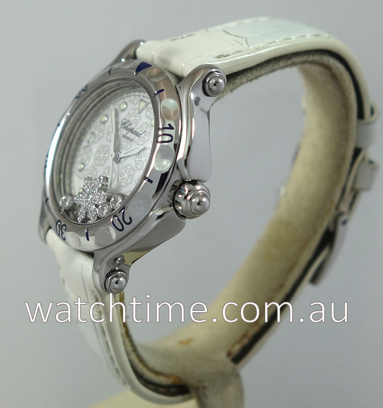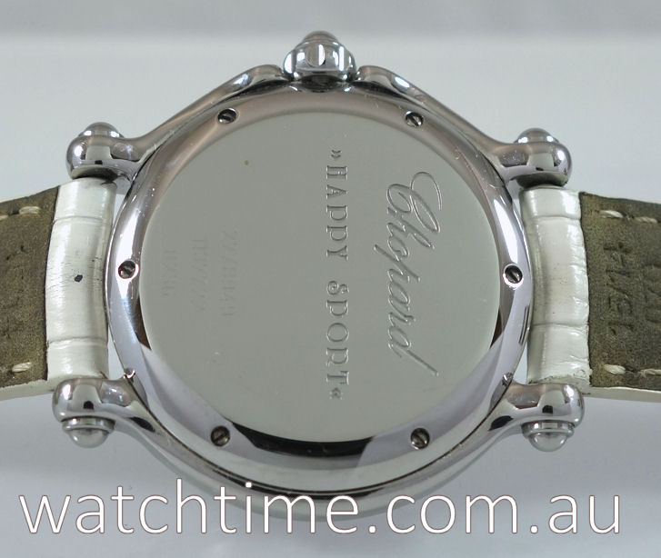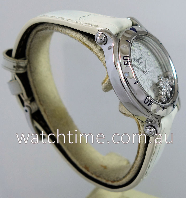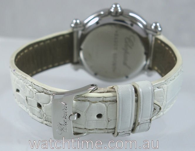 | Band | White Croco-leather and steel in buckle by Chopard. |