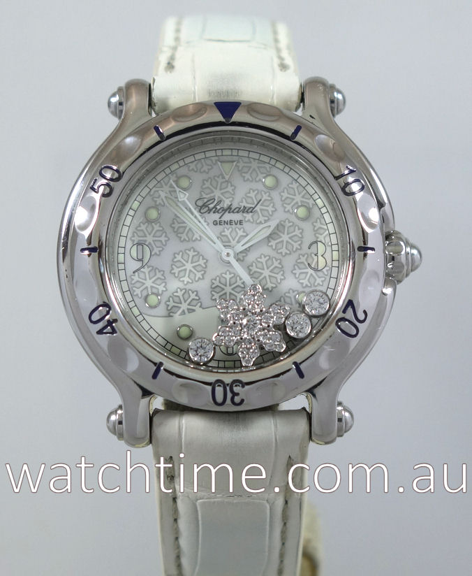 | Dial | Silver dial featuring snowflakes, white hands and luminous hour indices. Date at 6 o’clock. Three floating Diamonds (0.17CT) and a floating Diamond-set Snowflake (0.08CT). |