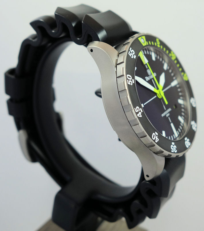 | Dial | Matt-Black with luminous indexes and hands, yellow centre-seconds and date between 4 / 5 o’clock. |