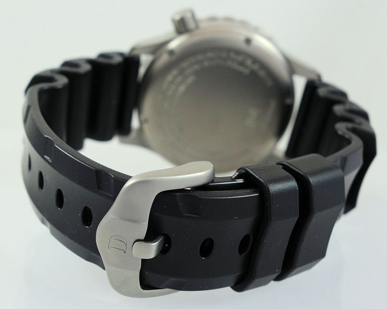 | Band | Black rubber and steel pin buckle. |