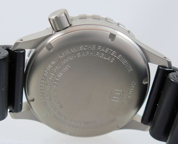 | Case | Bead-blasted, hardened Submarine-Steel with screw-down crown. Diver’s bezel with yellow 15-min scale & SuperLuminova. Sapphire crystal glass. |