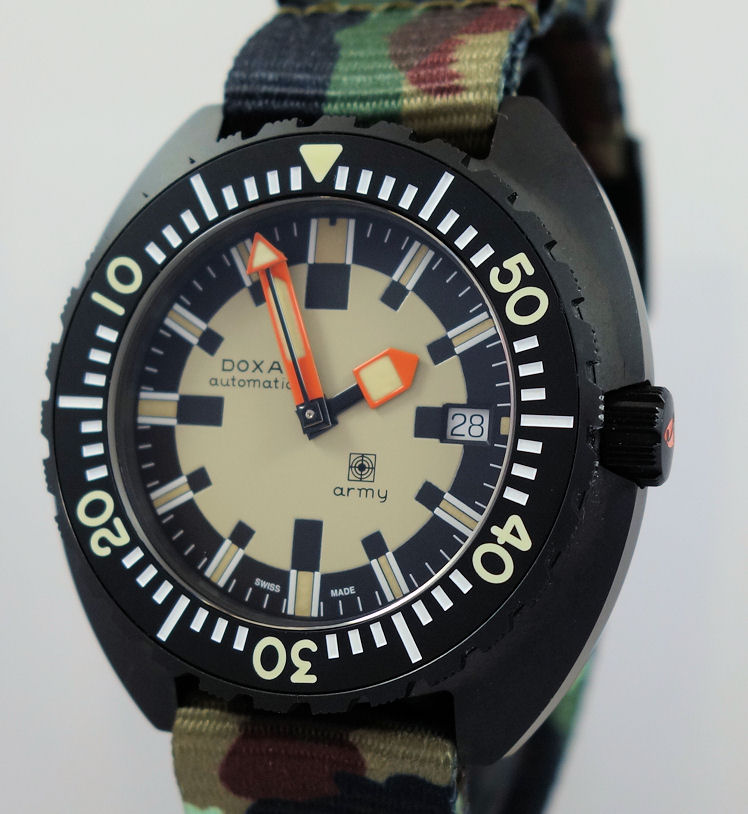 The Doxa Army Watches of Switzerland Edition is released in a limited run of 100 watches. It is immediately available from all Watches of Switzerland retail outlets where Doxa is represented, and on the Watches of Switzerland and Doxa Watches e-commerce platforms. The black ceramic Doxa Army watch is priced at AU $6400