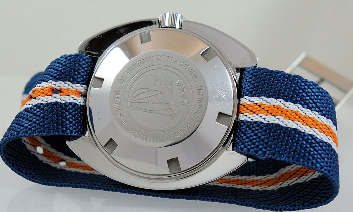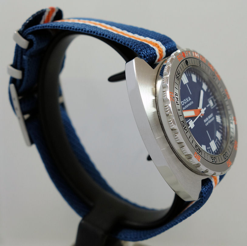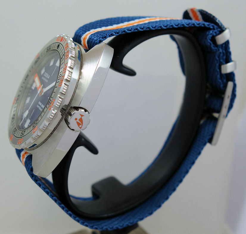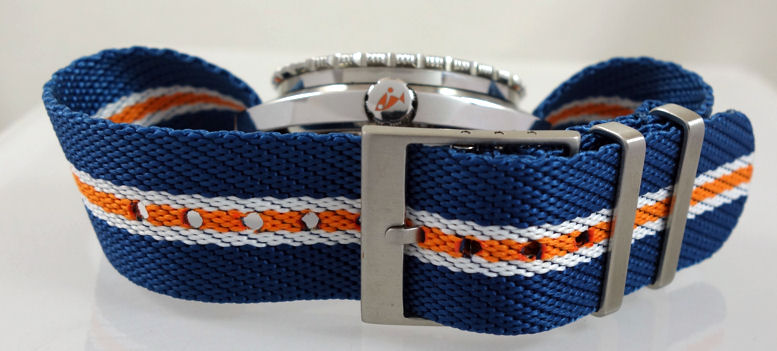 | Band | Blue, white & orange NATO strap with steel pin buckle. |