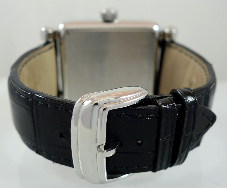 | Band | Black Alligator leather and steel pin buckle by FM. |