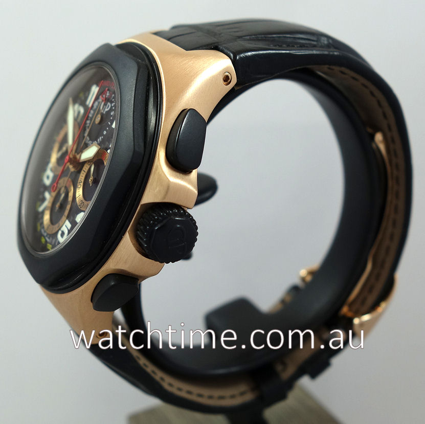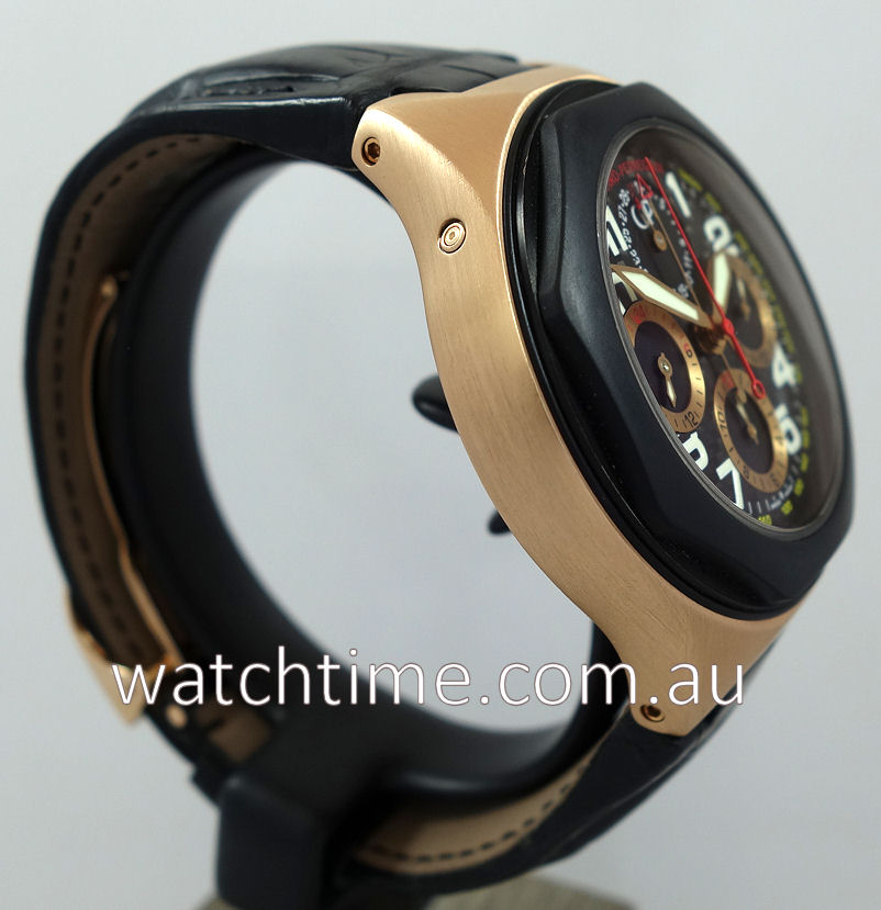 | Case | 18k brushed Rose-Gold, rubber coated bezel, push-pieces and crown. Sapphire crystal glass. |