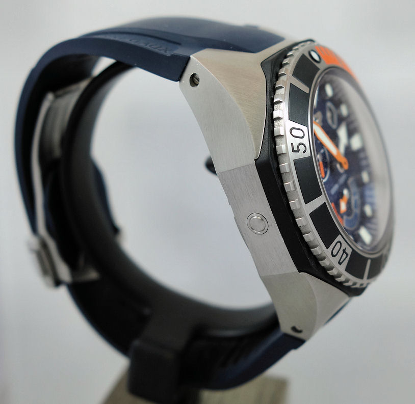 | Case | Brushed Steel. Octagonal diver’s bezel in black / orange. Sapphire crystal glass. |