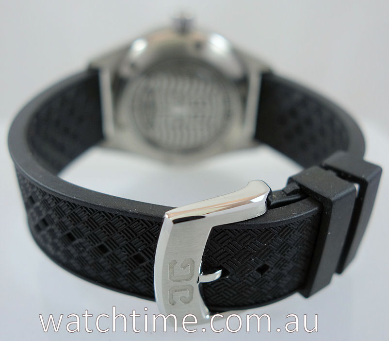 | Band | Black textured Rubber strap with steel pin buckle. |