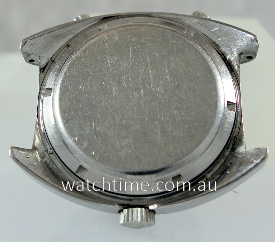 | Case | Stainless-steel barrel shaped case with crown on left side and pushers on the right. Screw-back. Plexiglas. Steel uni-directional bezel with black/silver insert. |