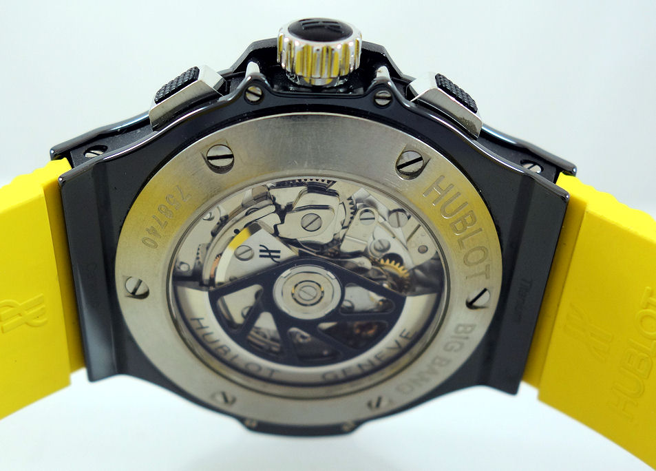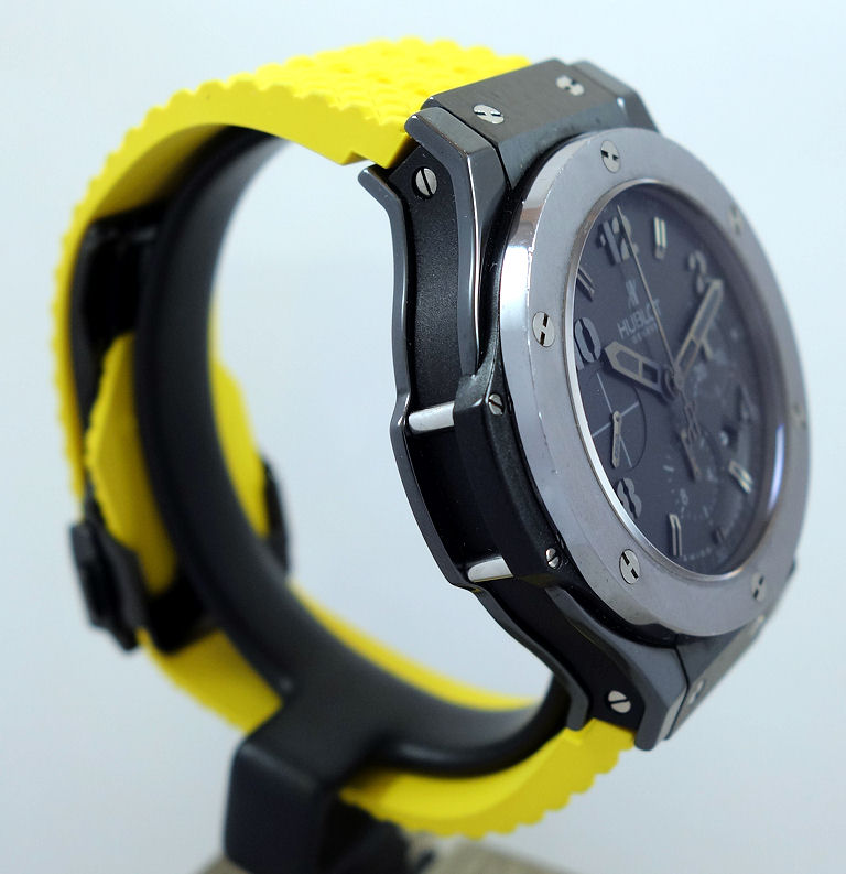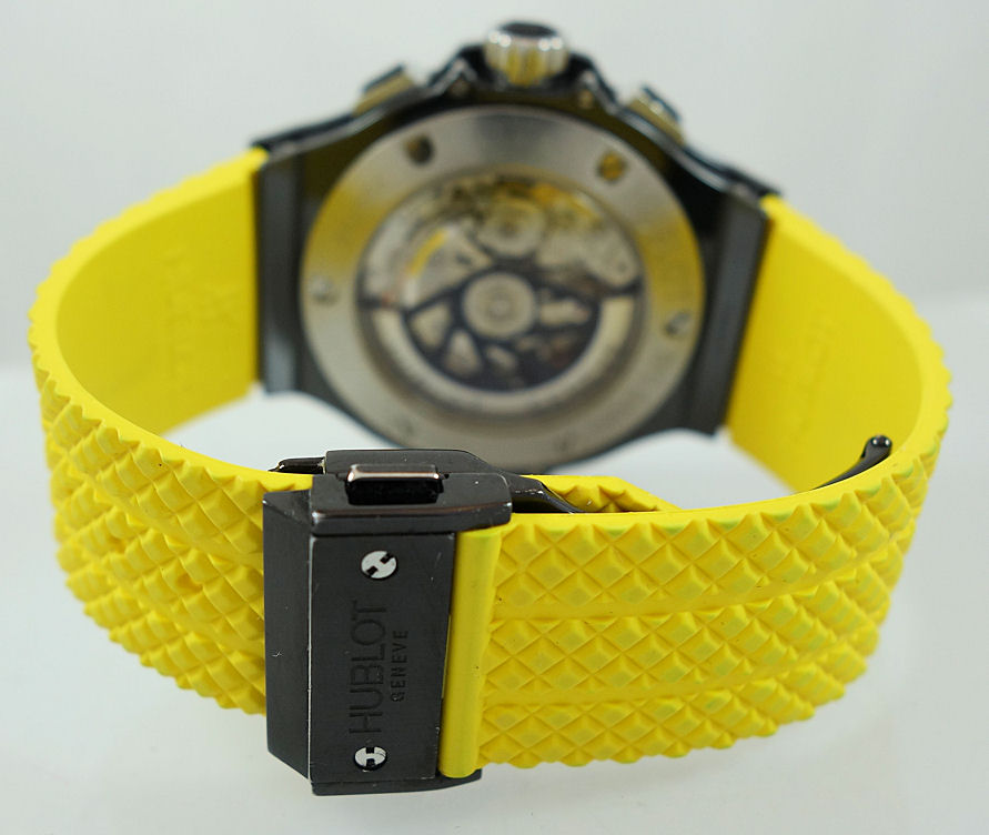 | Band | Yellow Hublot rubber strap and folding clasp. Comes with the original black rubber strap also. |