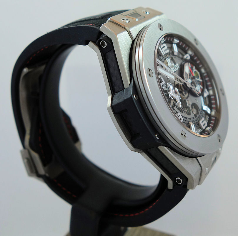 | Case | Brushed Titanium case with Carbon-fibre middle. Bezel fixed with 6 screws. Sapphire crystal glass. Display case-back feat. wheel design for the rotor. |