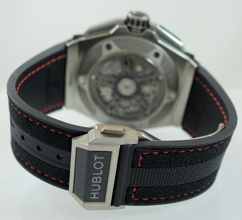 | Band | Black Leather and Rubber strap with titanium and carbon-fibre deployment buckle. Additional black rubber strap with red accent stitching with folding clasp. |