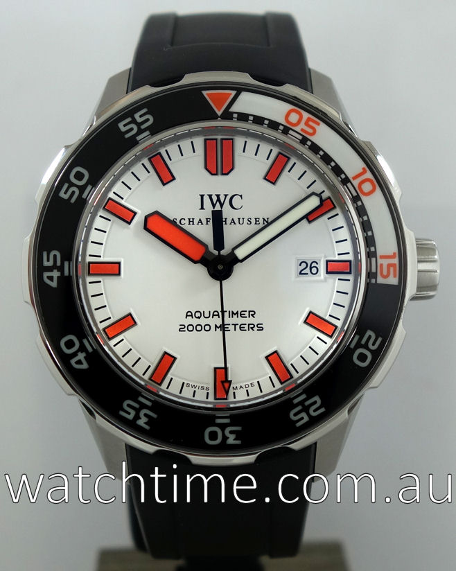 | Dial | White dial with bold blackened steel rimmed applied index hour markers filled with orange colored luminescent material. |