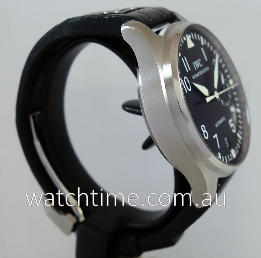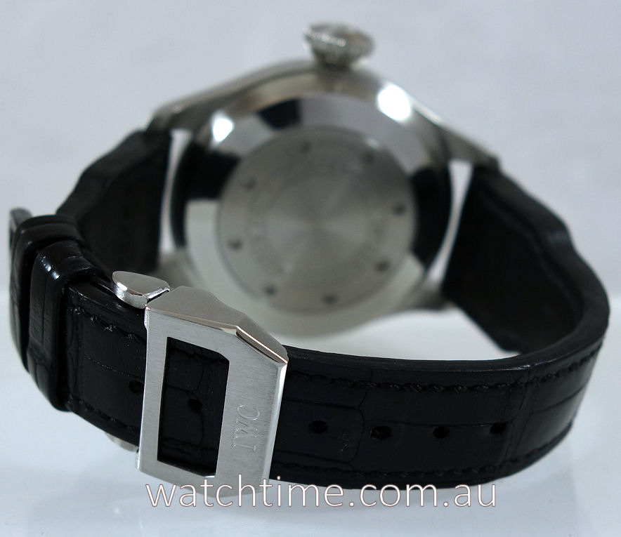 | Band | Black Alligator leather with steel rivets and steel folding clasp by IWC. |
