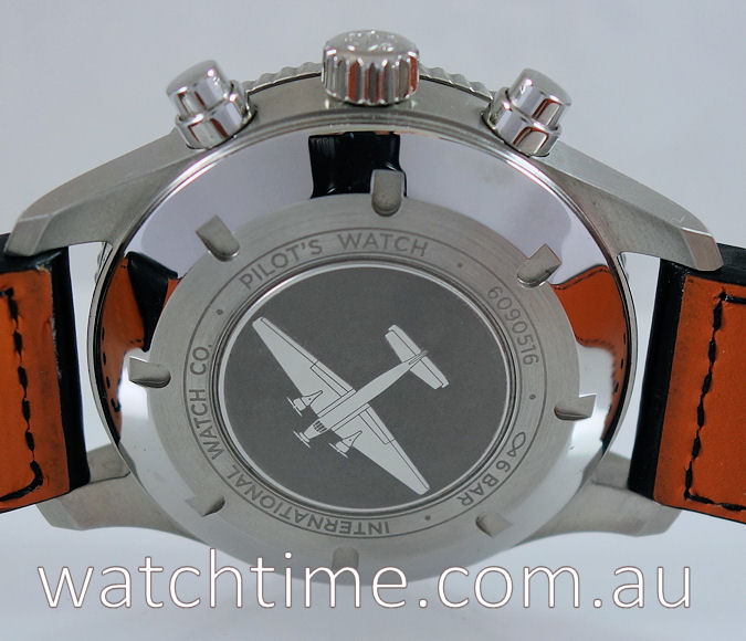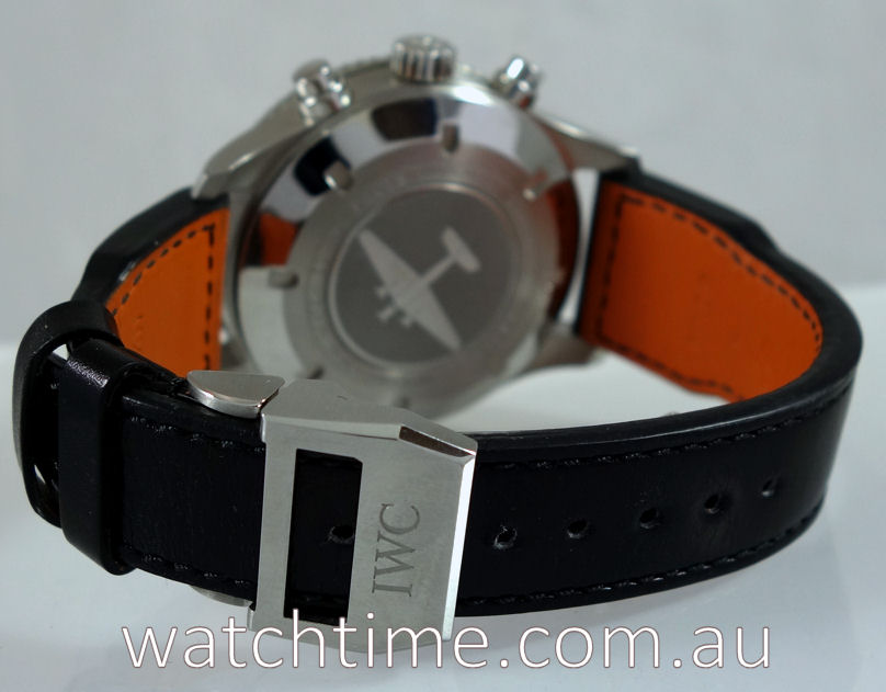 | Band | Black calfskin strap by Santoni (for IWC) and steel folding clasp by IWC. |