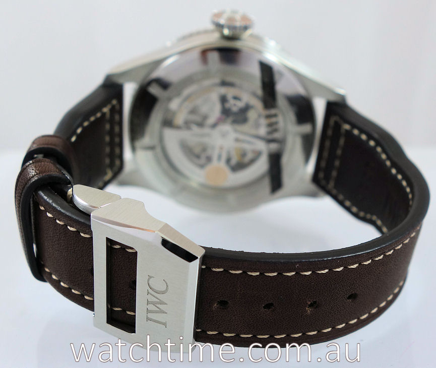 | Band | Brown calfskin strap by Santoni (for IWC) and steel folding clasp by IWC. |