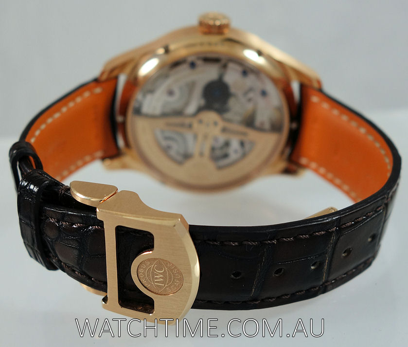 | Band | Dark brown Alligator leather strap by Santoni and 18k Red-Gold folding clasp by IWC. |