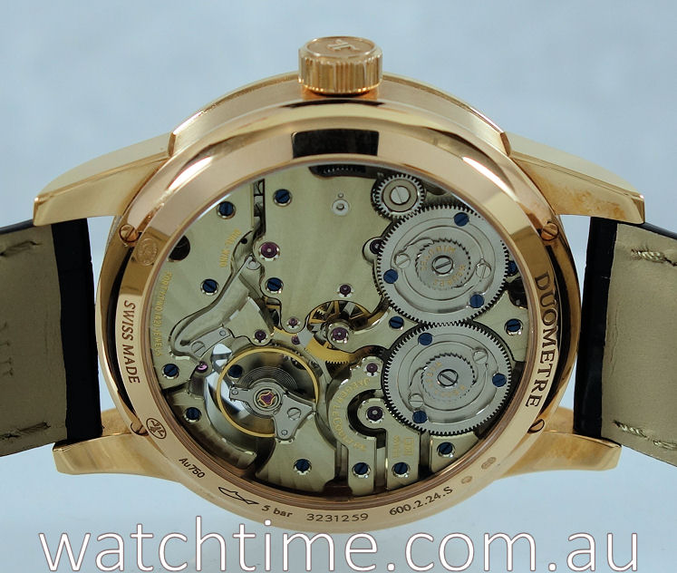 | Case | 18k Pink-Gold case with polished bezel, brushed sides, sapphire crystal top and back. Pusher at 10 for quick-set date and inset pusher at 11 for moon-phases. |