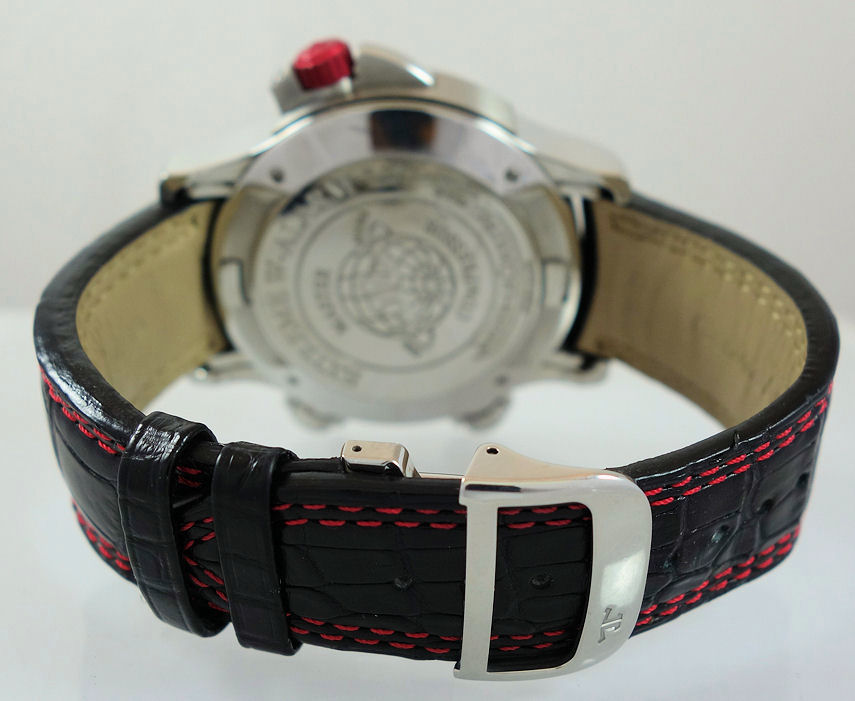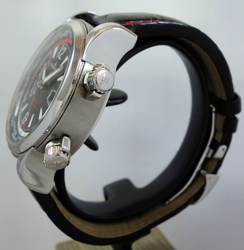 | Band | Additional black rubber strap., Black leather with contrasting stitching and steel folding clasp by JLC. |