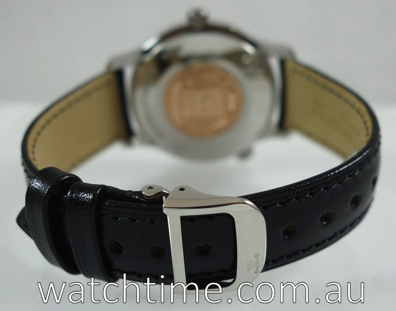 | Band | Black leather (not JLC) with original steel folding clasp by JLC. |