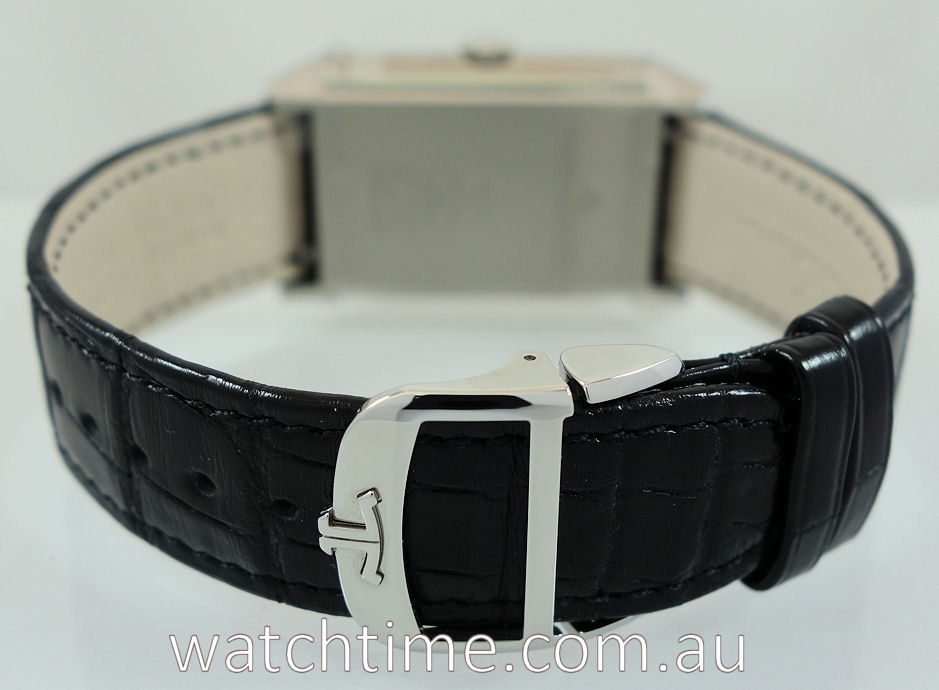 Polished stainless-steel rectangular, reversible case with sapphire crystal glass. Solid, unengraved back.
